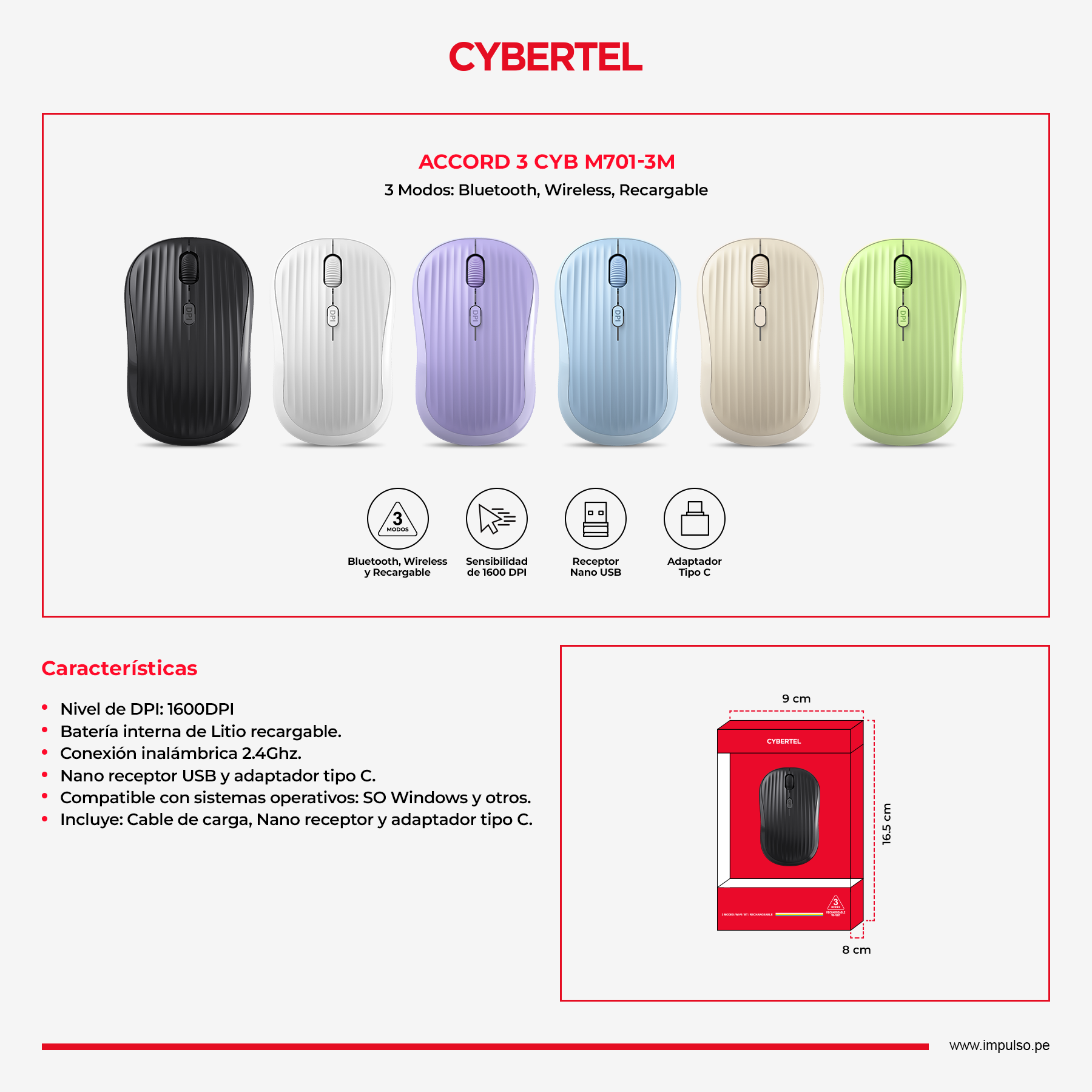| 3 Modos: Bluetooth, Wireless, Recargable. | ||||